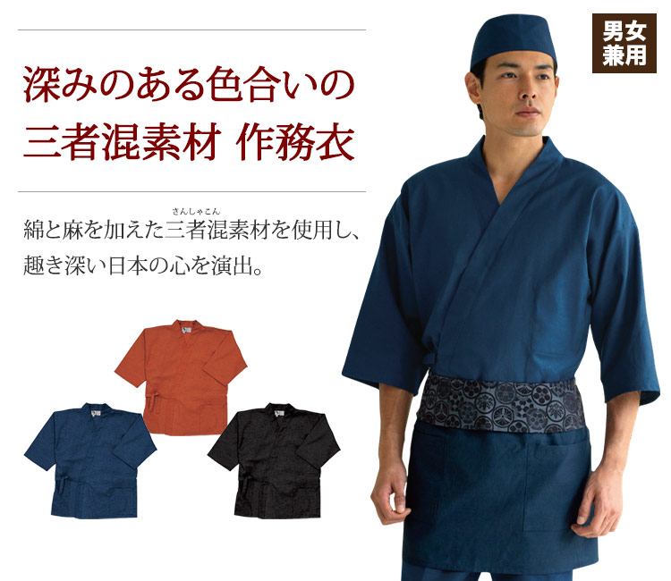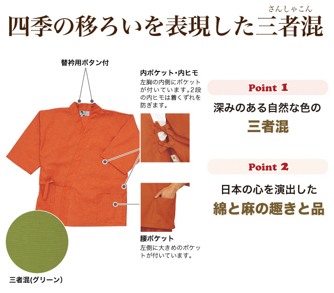 絶妙な四季の移ろいが生み出した深みのある自然の色を三者混で表現しました。 綿と麻を加えた趣きと品が日本の心を演出します。 お揃いの作務衣パンツもあります。