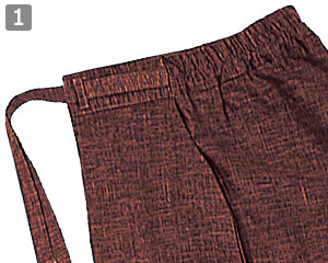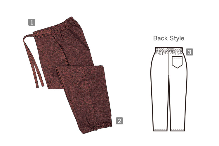 ウエスト部分はサイズ対応を考慮したヒモ付き仕様。また後ろゴム入りでフィット感があります。