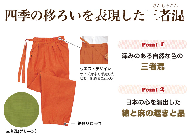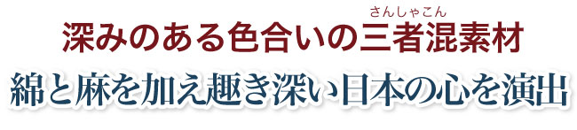 絶妙な四季の移ろいが生み出した深みのある自然の色を三者混で表現しました。 綿と麻を加えた趣きと品が日本の心を演出します。 お揃いの作務衣上衣もあります。
