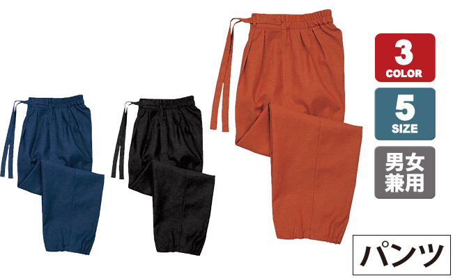 - ウエストはサイズ対応を考慮したヒモ付き(後ろゴム入り)、裾絞りヒモ付