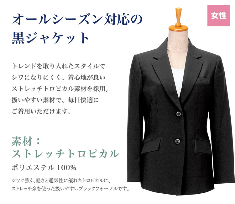 ボンユニの女性用ジャケット。オールシーズン対応でしわになりにくく、扱いやすいストレッチ素材で 動きやすく快適な着心地です。