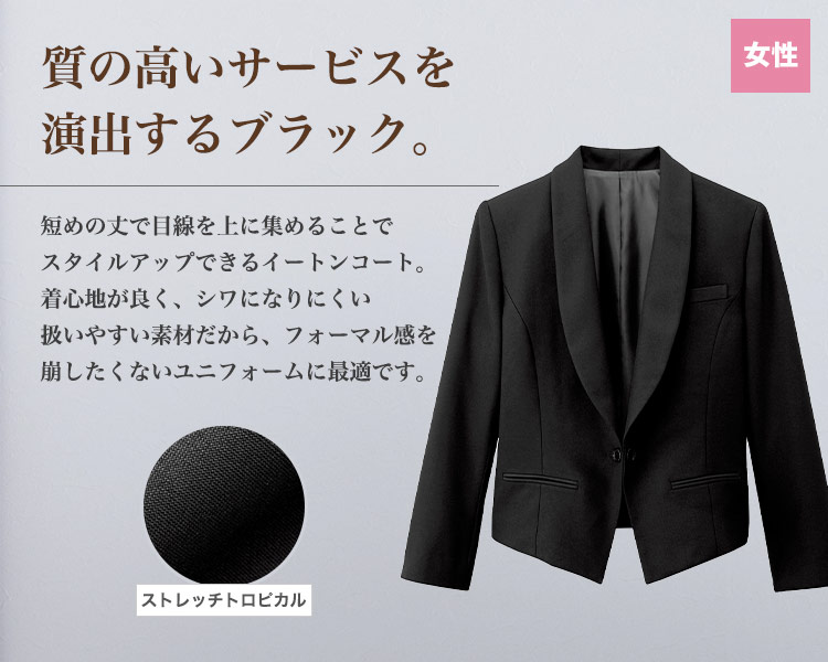 【仕様】ストレッチ素材、ショールカラー、片穴拝み釦、外ポケット3個、内ポケット2個、総裏地付
