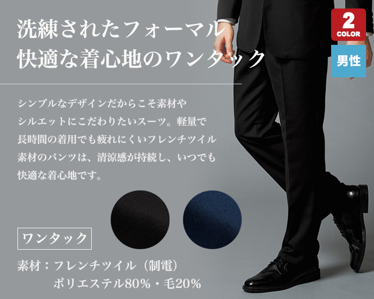 ボンユニの男性用ワンタックスラックス。長時間の着用でも疲れにくい様、軽量化を実現。 ワンランク上の上質素材はホテルマン・ブライダルなどにおすすめのワンタックスラックス。