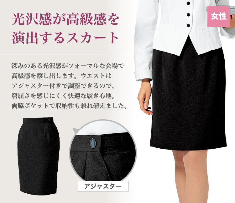 ボンユニのアジャスタースカート。レディース拝絹タキシードとお揃いのスカートは、高級感と深みのある黒の光沢感で質の高いサービスを演出します。
