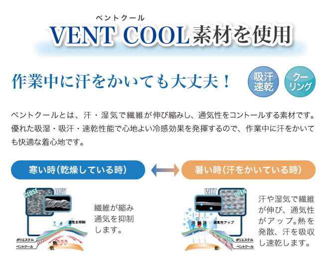 汗・湿気で繊維が伸び縮みし、通気性をコントロールするベントクール素材が