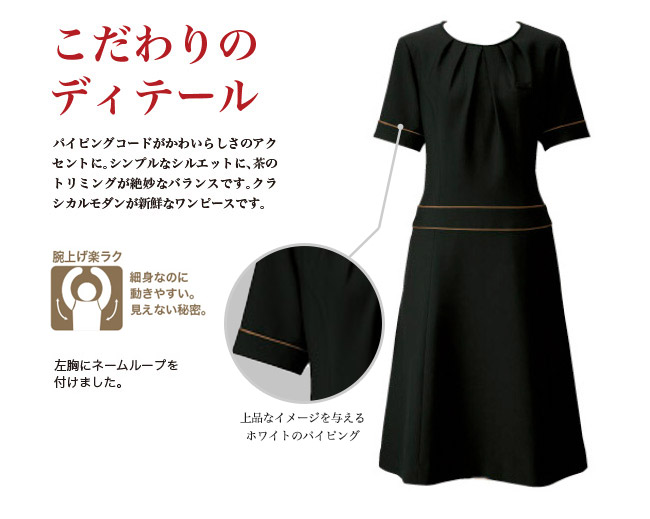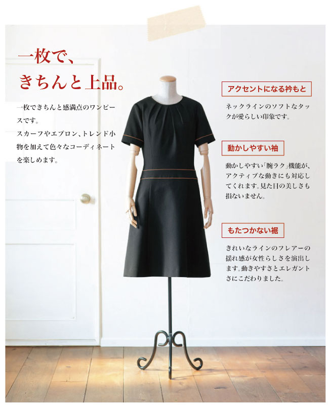 ボンユニのワンピース。エレガントで美しいシルエットでおしゃれ。ストレッチ・制電の黒ワンピースは細身なのに動きやすく、腕上げ楽ラクです。