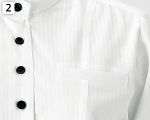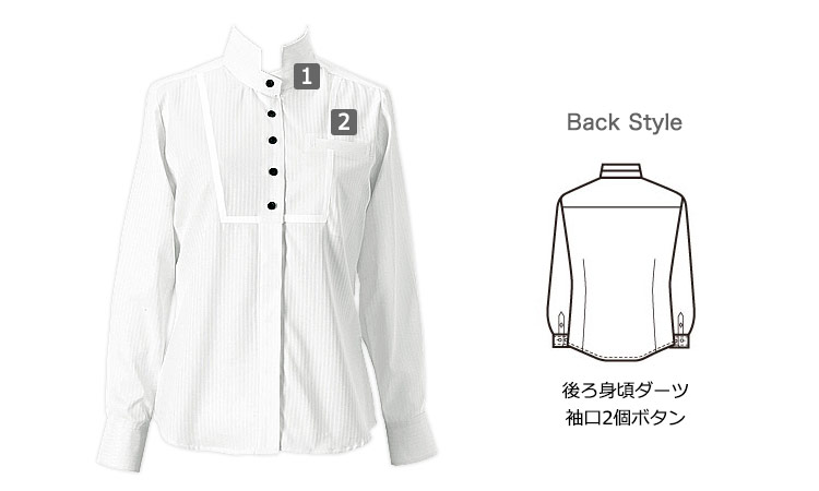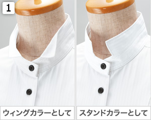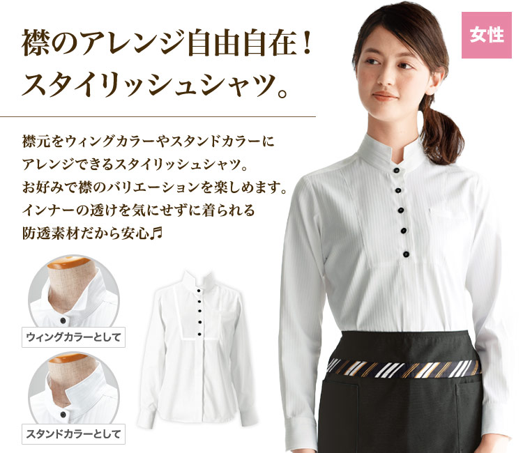 ボンユニの女性用シャツ。襟元をウィングカラーやスタンドカラーに自由にアレンジできるスタイリッシュシャツ。 お好みで襟のバリエーションを楽しめます。 インナーの透けを気にせずに着られる防透素材だから安心♬ カフェやパン屋などのユニフォームにおすすめです!