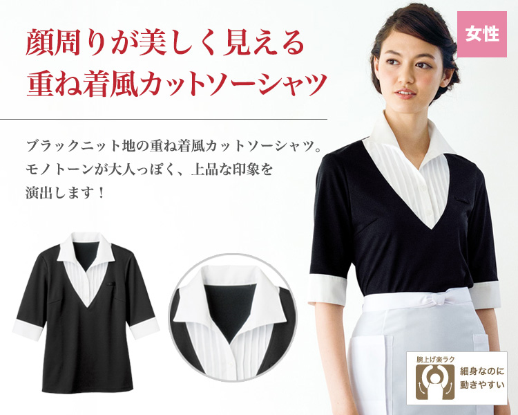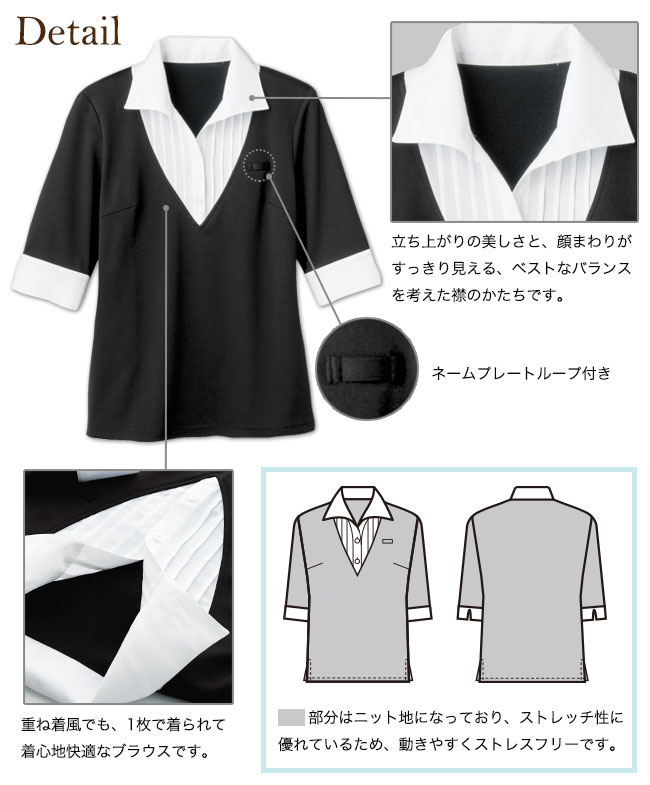 ボンユニの重ね着風ブラウス。ブラウスとニットの重ね着に見えるおしゃれなデザイン。ニット生地は吸汗速乾やストレッチ性、透けにくさがあるのが女性に嬉しい!
