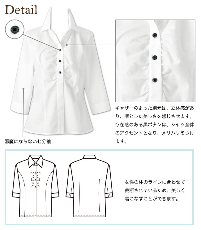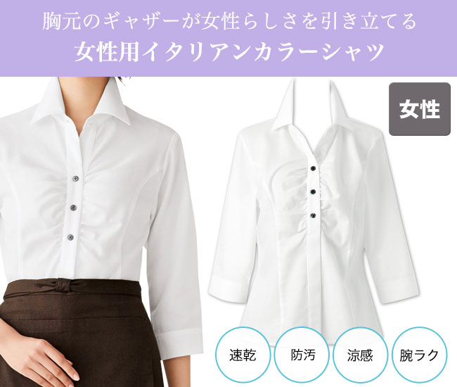 ボンユニの七分袖イタリアンカラーシャツ。ギャザーのよったデザインがフェミニンなシャツは、女性の体のラインに合わせた裁断で美しいシルエットが魅力。涼感で涼しく着られ、速乾性があるのも嬉しい。