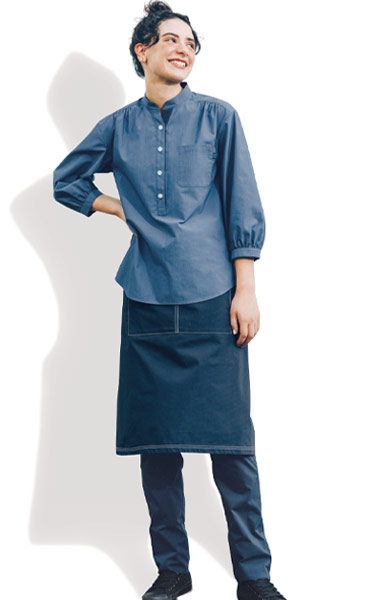 色落ちしにくく、軽量で扱いやすいデニム調素材。吸汗速乾性やストレッチ性に優れており、涼しくて動きやすい高機能な素材です。また白い点々が接触面を少なくするため、肌にまとわり付きにくいといった特徴もあります。