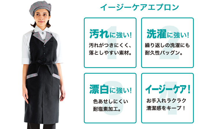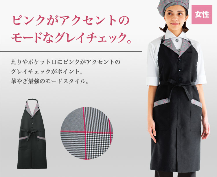 ボンユニのベスト付エプロン。スタイリッシュなベスト付きレディースエプロンは、トラッドなグレンチェックにピンクをプラス♪撥水・撥油・防汚・制電・イージーケアなど機能性に優れたエプロンです。