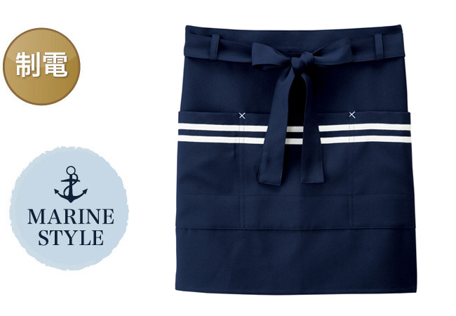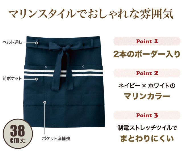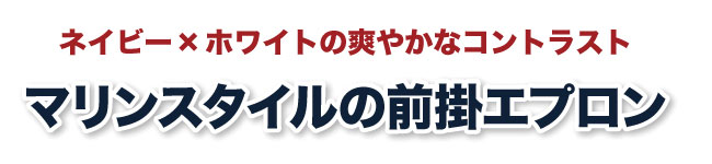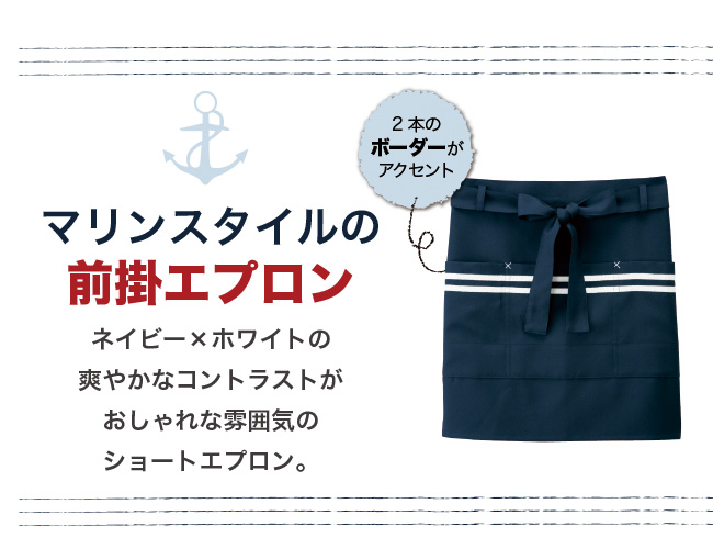 ボンユニの前掛けエプロン。2本のボーダーがアクセントになったマリンスタイルのショートエプロンは、ネイビー×ホワイトの爽やかなコントランスがおしゃれ!