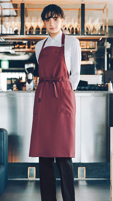 BONUNIの胸当てエプロン。高級感のあるヘリンボーン織りとおしゃれな色展開が特徴で、水などの汚れや不快な静電気を防ぐ機能性の高さや、お尻が隠れるデザインで、見た目・機能ともにハイレベル!