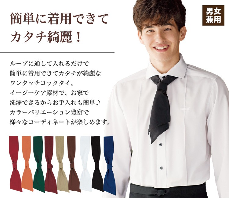 ループに通すだけで着用可能で、カタチも綺麗に決まるワンタッチコックタイ! 汚れ・洗濯・漂白・静電気に強い高機能でイージーケアな素材。 カラーバリエーションも豊富!色違いで揃えてもおしゃれです。