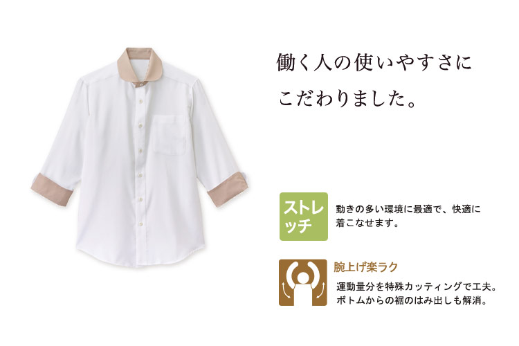 - イージーケア、腕上げ楽ラク、ストレッチ素材、左胸ポケット、ネームプレートループ、袖先スリット