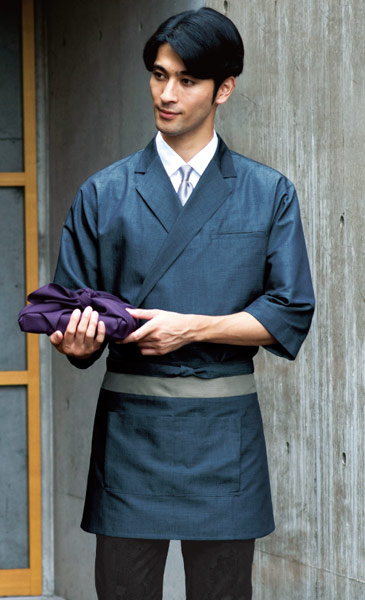 テーラードカラーを和装に取り入れたデザイン。デニム風素材を使用することで、フォーマルな中にも今っぽさがあり、和モダンなお店や宿泊施設にぴったりの和風シャツです。紐を結んで着る作務衣仕様で、左胸と腰にはポケットが付いており収納力も優れています。