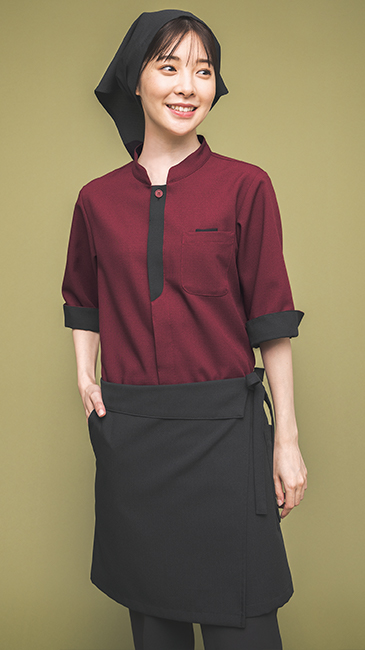和・洋・中華にも馴染むモダンなスタンドカラーに前立ての配色デザインが印象的なアクセントに。