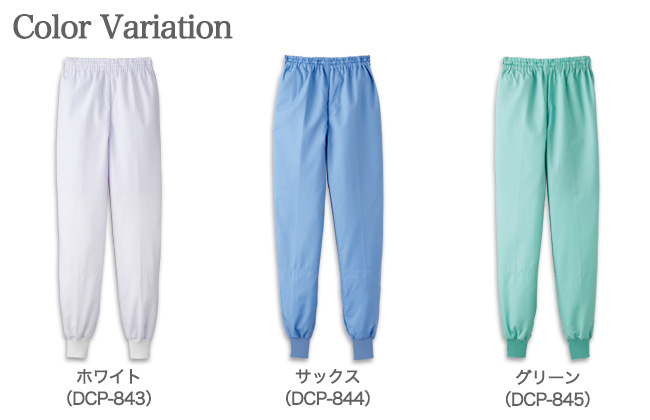 - 冷感、抗菌、制電、吸汗、速乾、ウエストゴム取り替え口、スピンドル入り、ウエスト総ゴム、異物混入対策仕様ボトムス、下着透け防止共布二重仕様、キーポケット付き、裾口フライス仕様、インナー長袖口ゴム仕様