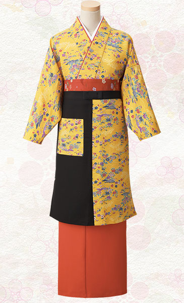 二部式着物、茶衣着は一人で簡単に着られる上、上下の組み合わせも自由にできます。帯や前掛けを組み合わせることでよりお店にあった和の装いが可能です。