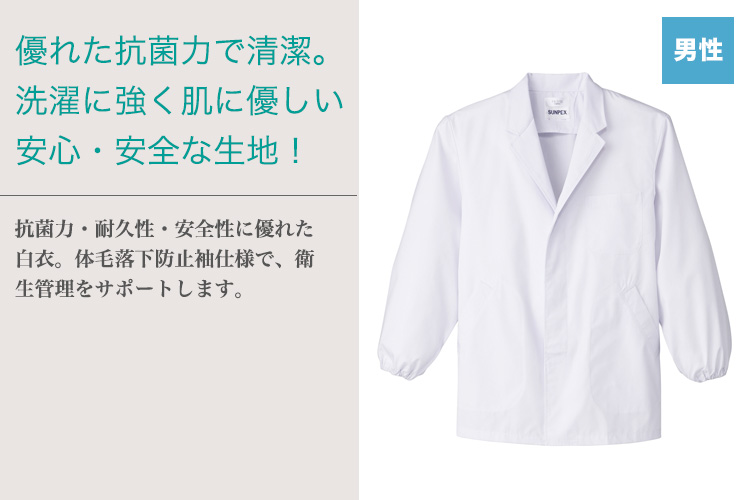 - 前身ヒヨクボタン留め、左胸、両腰ポケット有り、体毛落下防止袖仕様