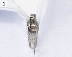 セミオートのストッパー機能付きの「セミオートコイルファスナー」なので、作業中に衣服が開くのを防止します。
