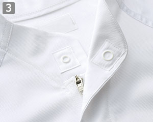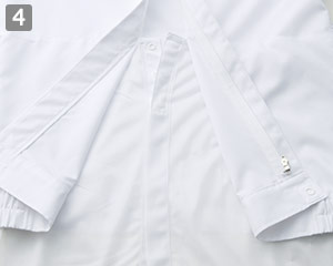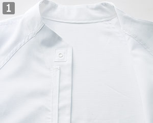 襟にスナップボタンをつけ、フードを押さえてケープのズレや浮きを防止します。前立ては比翼仕立てにすることで、洗濯時のファスナーの損傷防止とファスナーを隠すことにより作業中の安全性を高めてくれます。
