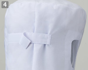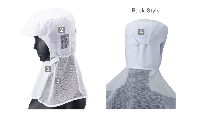 - ツバ素材…織芯、額・頬素材…パイル、前部留め…マジックテープ、ケープ素材…メッシュ、後頭周り調整…マジックテープ、耳部素材…メッシュ(粗目)