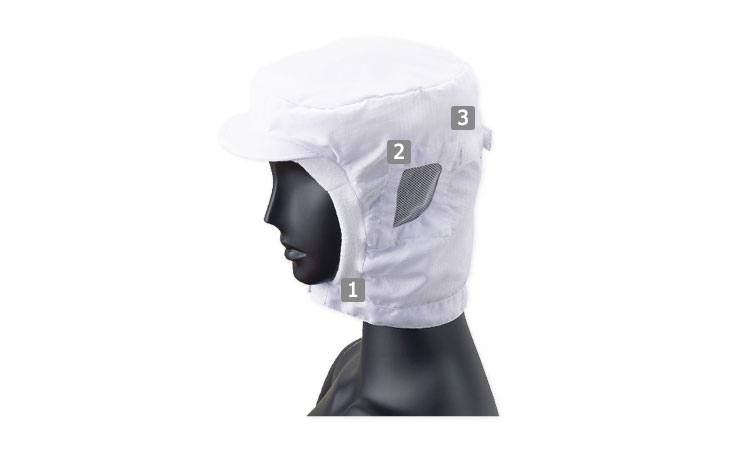 - ツバ素材…織芯、額・頬素材…パイル、前部留め…マジックテープ、後頭周り調整…マジックテープ、耳部素材…メッシュ(粗目)