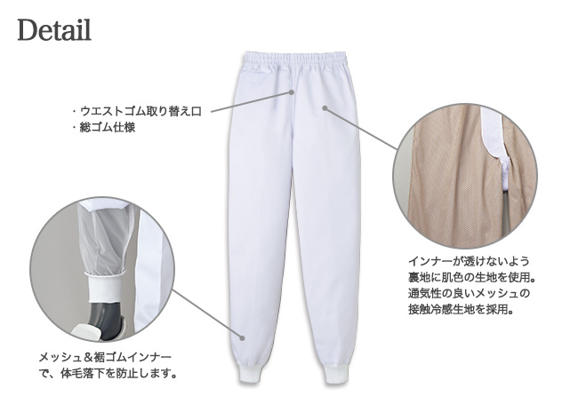 - 冷感、抗菌、制電、吸汗、速乾、ハセップ支援、ウエストゴム取り替え口、ファスナーなし、共紐入り、総ゴム、接触冷感透け防止裏地付き