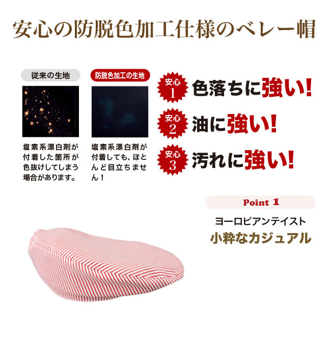 ヨーロピアンテイストのカジュアルなベレー帽(ヒッコリー柄) 色落ちに強い防脱色加工で漂白剤がはねても安心♪