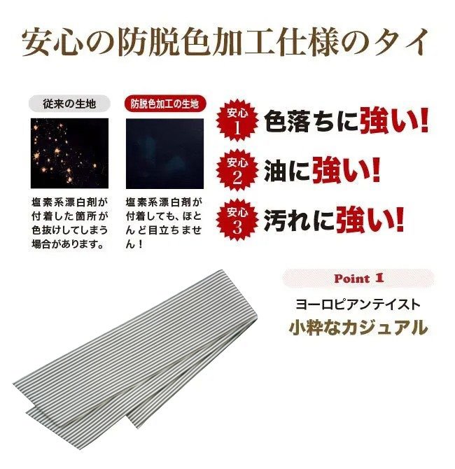 ヨーロピアンテイストのカジュアルなタイ(ヒッコリー柄)色落ちに強い防脱色加工で漂白剤がはねても安心♪