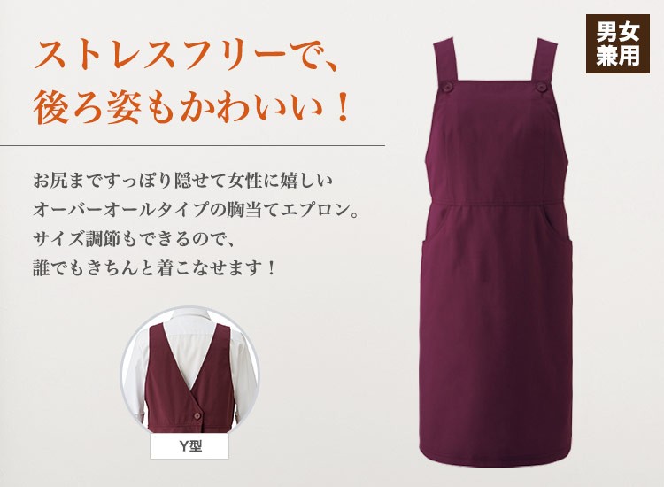 サーヴォのオーバーオールエプロン。お尻まですっぽり隠せて安心。男女兼用で揃えられます。