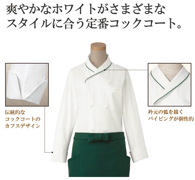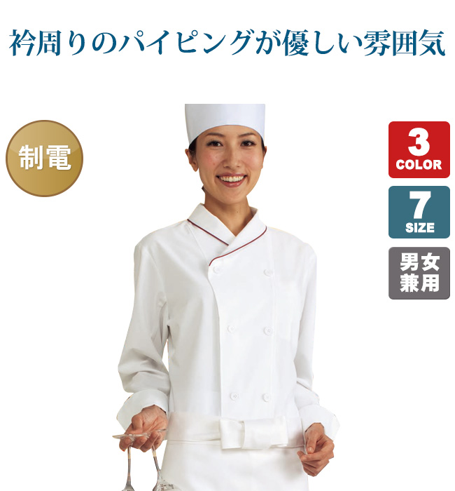 襟周りのパイピングが優しい雰囲気のコックコート。爽やかなホワイトでどんなお店にも幅広くおすすめ。