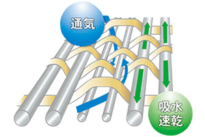 「すだれ」のような立体構造で通気性に優れ、サラッとした着心地で涼しさ抜群の生地です。吸汗速乾性に優れているため、汗をかいてもすぐに乾いて快適です。