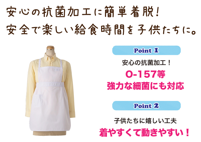 子供たちになじみのあるエプロン型の給食衣です。 サイズ豊富なので小さなお子様でも安心してご着用いただけます。