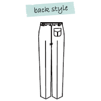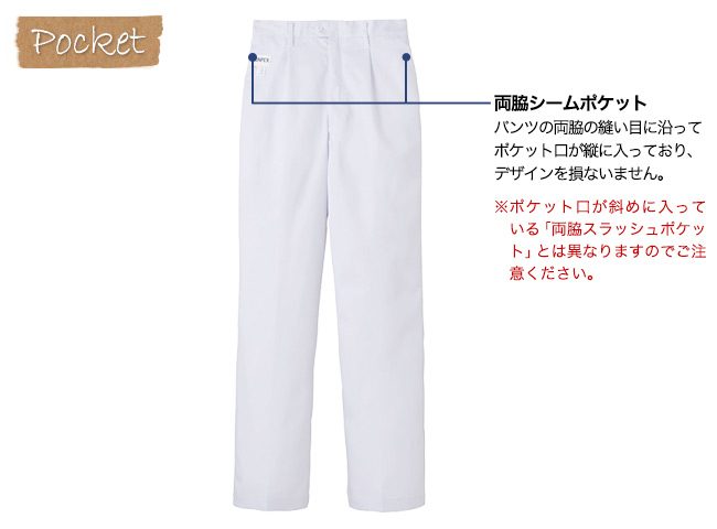 - 右後外ポケット、前ファスナー、両脇シームポケット