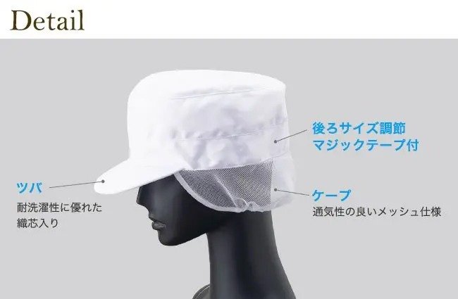 - ツバ素材…織芯、ケープ素材…メッシュ、後頭まわり調整…マジックテープ