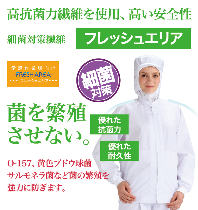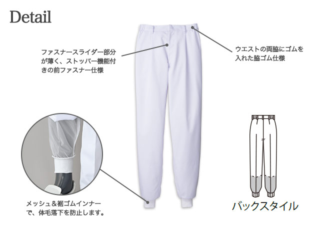 - 抗菌、制電、ハセップ支援、前セミオートコイルファスナー、脇ゴム、異物混入対策仕様ボトムス、キーポケット付きパンツ、裾口フライス仕様、インナー裾口ゴム仕様