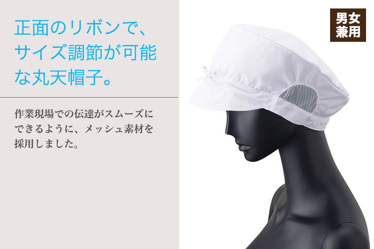 正面のリボンで、サイズ調節が可能な丸天帽子。