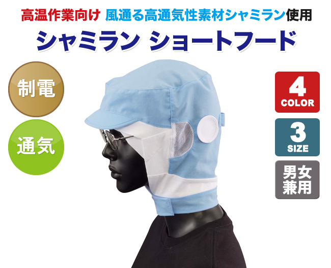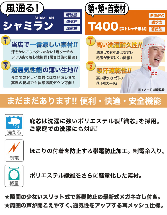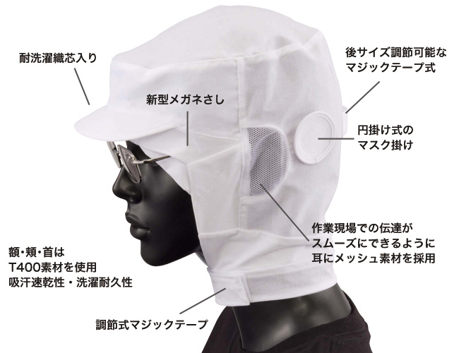- ツバ素材…織芯、額・頬・首素材…T400、前部留め…マジックテープ、 マスク掛け…円掛け式、メガネさし…新式、後ろサイズ調整…マジックテープ、耳部素材…メッシュ(粗め)
