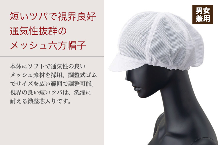 本体にソフトで通気性の良いメッシュ素材を採用。 ツバは洗濯に強い織り芯入り。サイズ調整範囲が大きい引き出しゴムつきです。