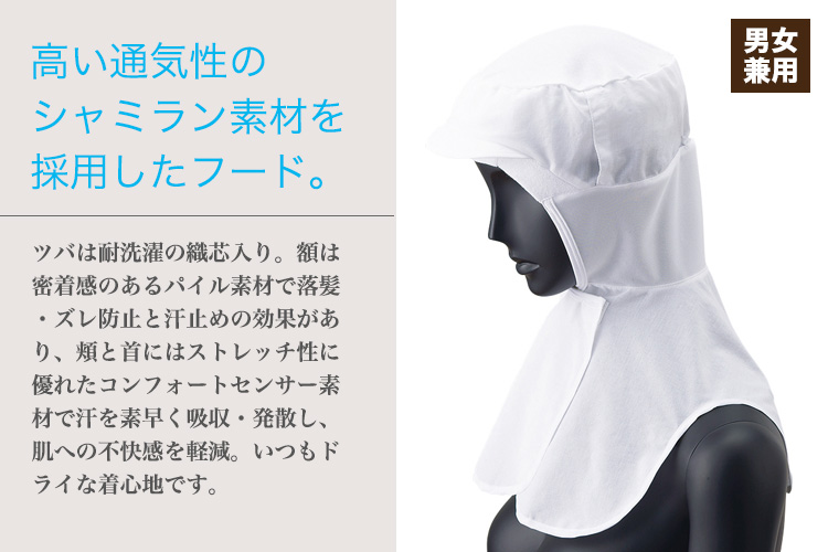 高い通気性のシャミラン素材を採用したフード。 ツバは耐洗濯の織芯入り。 額は密着感のあるパイル素材で落髪・ズレ防止と汗止めの効果があり、 頬と首にはストレッチ性に優れたコンフォートセンサー素材で汗を素早く 吸収・発散し、肌への不快感を軽減。いつもドライな着心地です。 立体ケープは動きやすさを考慮。