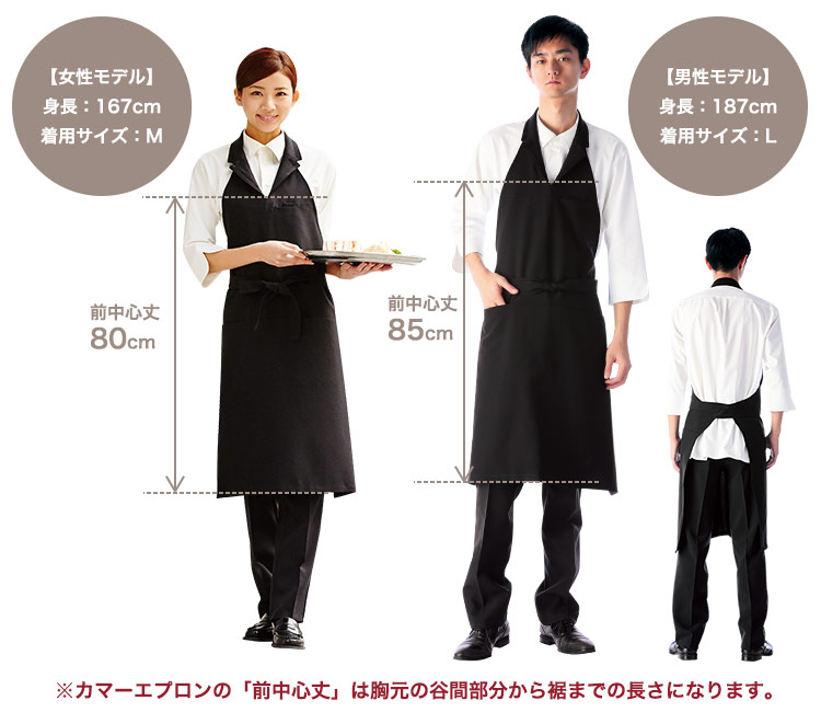 仕事で使ってます。襟がついてるのでTシャツや、襟なしブラウス等カジュアルなトップスとあわせてもきちんと感が出ます。腰ひもは長めなので、前にまわして結ぶカフェエプロンのタイプです。しわになりにくく、乾きやすいので、本当に使い勝手がいいです。 158センチ60キロと太っていますが、Mサイズでちょうど良かったです。