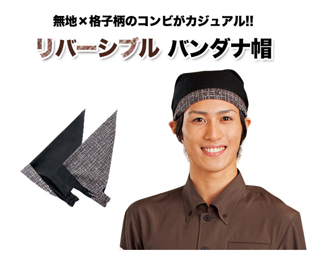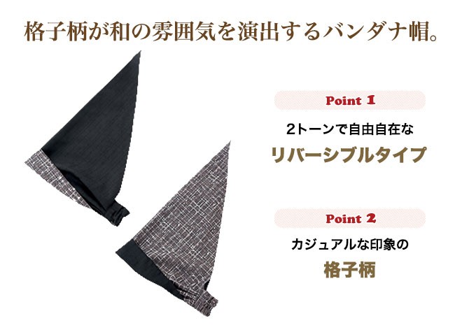 無地×格子柄のコンビがカジュアル!! 和の雰囲気を演出する色合いのリバーシブルバンダナ帽です。