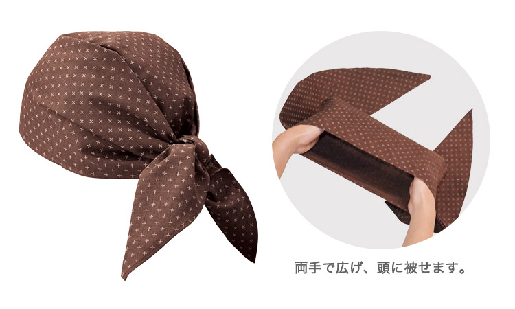 「和」を現代的にアレンジした和モダンバンダナ帽。 計算した小振りの十文字柄バンダナ帽でお洒落なスタイルがお手軽に実現します。 カフェ・和食店・ライフスタイルストアなど様々なシーンにマッチします。