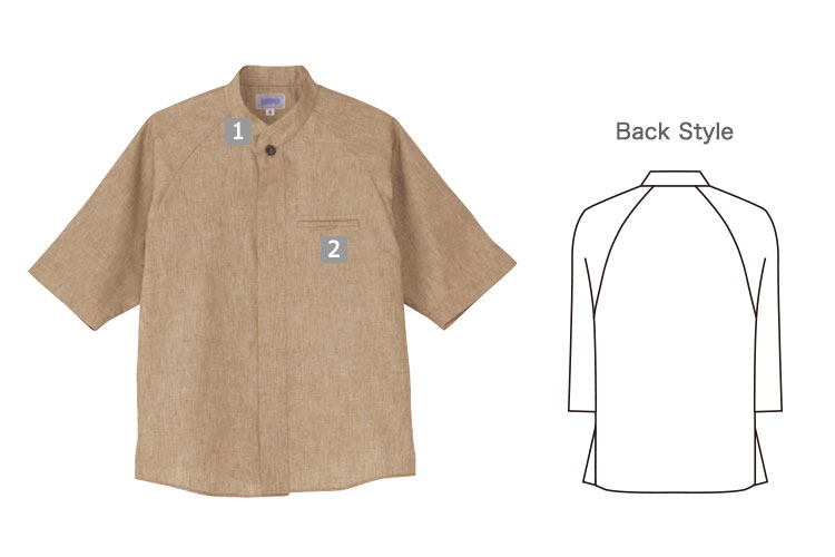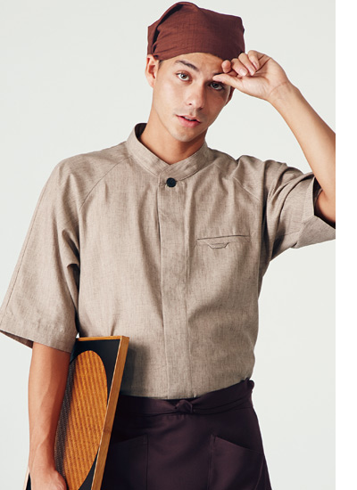 和はもちろんエスニックなスタイルまでお使いいただける、麻を混紡した素材のショップコート。ナチュラルなカラーで優しげな印象を与えます。