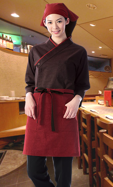 洋風のシルエットに作務衣のような前合わせをプラスした和モダンなデザインは、和食料理店に限らず、和風カフェや和菓子屋など幅広いショップにマッチします。