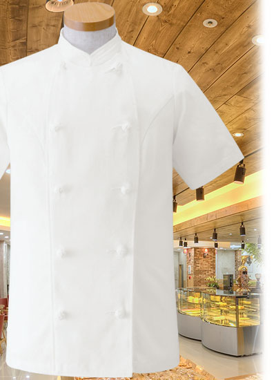 清潔感と機能性を追求したレディース半袖コックコート!女性のボディラインに合わせた作りで、すっきりとしたシルエット。半袖なので暑い厨房でも涼しく着用できます。綿100%で肌触りがよく、カツラギ(薄手)という丈夫な素材でしっかりとしているため、高級感があります。