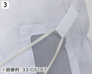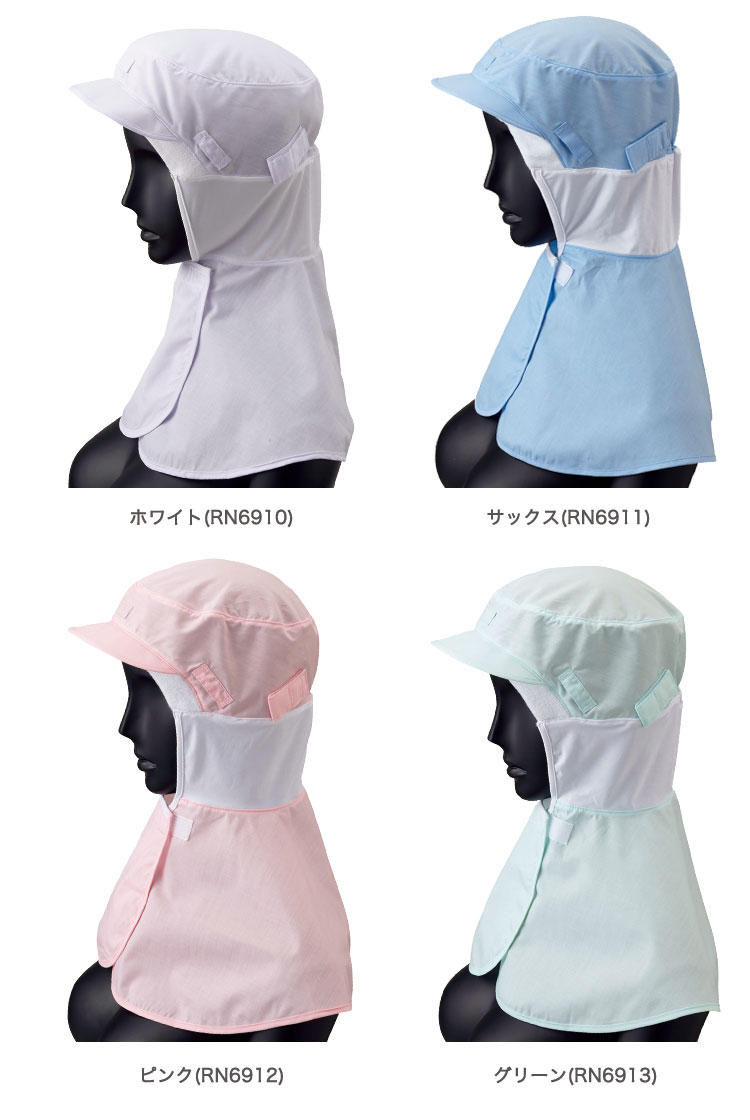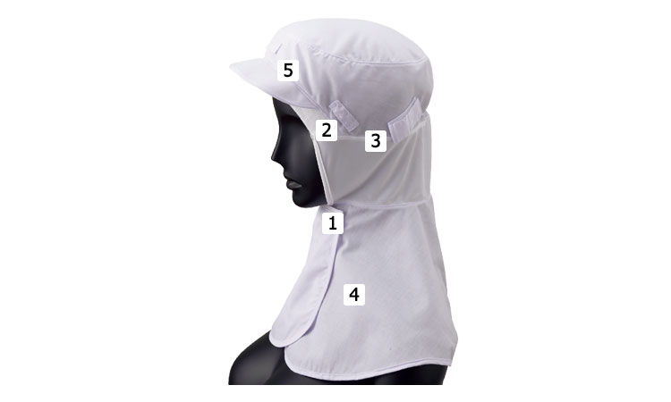 - ツバ素材…織芯、額素材…パイル、頬・首素材…ストレッチ素材、前部留め…マジックテープ、マスク掛け…タブ掛け式(マジックテープ)、メガネさし…スリット式、ケープ素材…共布、その他…前頭部ネームプレート用力布付き