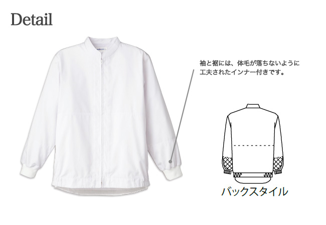- 抗菌、制電、ハセップ支援、セミオートコイルファスナー、マジックテープ(横付け)、異物混入対策仕様トップス、袖口フライス仕様、インナー長袖